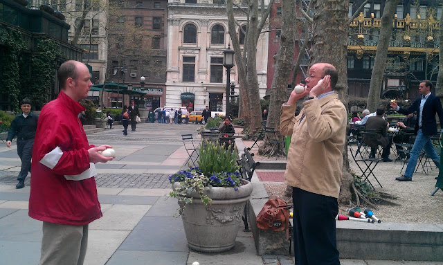 Gorgeous day, started off a little cold, but warmed right up. Krista walked into the park at the same moment that I did. A new guy named Paul showed up and has had some real clowning and juggling work experience. He was a Ronald McDonald at one point and also worked for Ringling Bros. at one point. We worked on a three person feed with varying degrees of success. Paul says he wants to come back. Here are a couple of pictures.