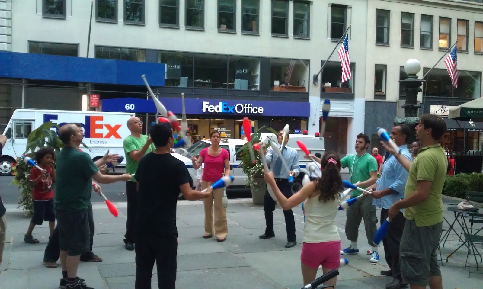 HIGHLIGHTS: Mr. Michael Karas was in the house! Wonderful to see him, for sure. Avram and Schmule showed up, repeat customers we taught to pass clubs two summers ago. An intriguing long time NY juggler named Peter was there with his Phi shirt. Bennett from Carmine made an appearance. We had ten club-passers in attendance and 31 clubs. We attempted two interlocking five-pointed stars (didn't work out so well), and then a 6 x 4 pattern that worked out better.